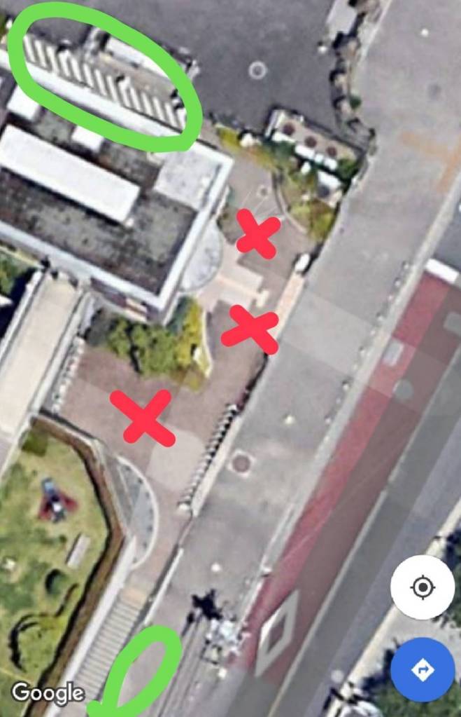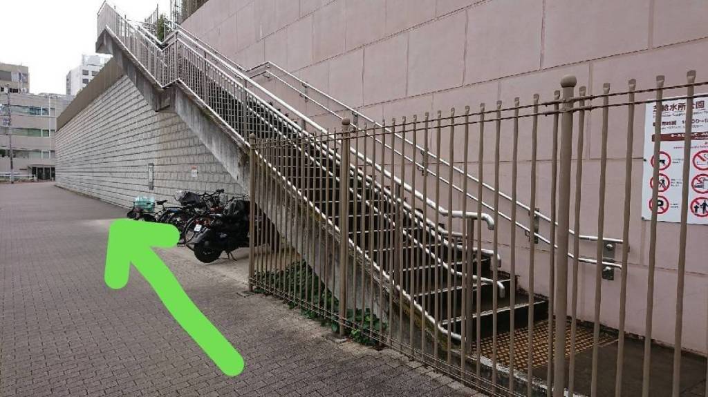 管理棟の前のスペース(ベンチ前やスロープ前)に停めるのは、自転車や荷物の出し入れ時の支障となるため、他団体との話し合いで禁止となっています。